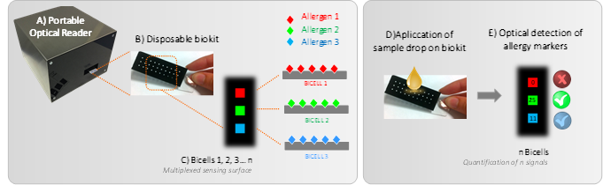 Scheme of idea of Allerscreening system. A) Point of care platform: optical reader. B) Disposable biokit: surface with multiple wells (BICELLs) for sample analysis. C) Detail of bicells, functionalized with different allergens. D) Application of drop of sample to the biokit. E) Detection of specific biomarkers in each bicell.